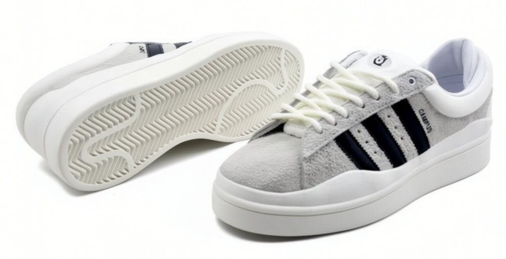 Это не просто кроссовки — это артефакт уличной культуры и желанный грайл для каждого настоящего ценителя стиля. Модель Campus, переосмысленная пуэрто-риканским суперзвездой Bad Bunny, теперь в классической серо-черно-белой цветовой гамме, которая станет универсальным акцентом любого образа.